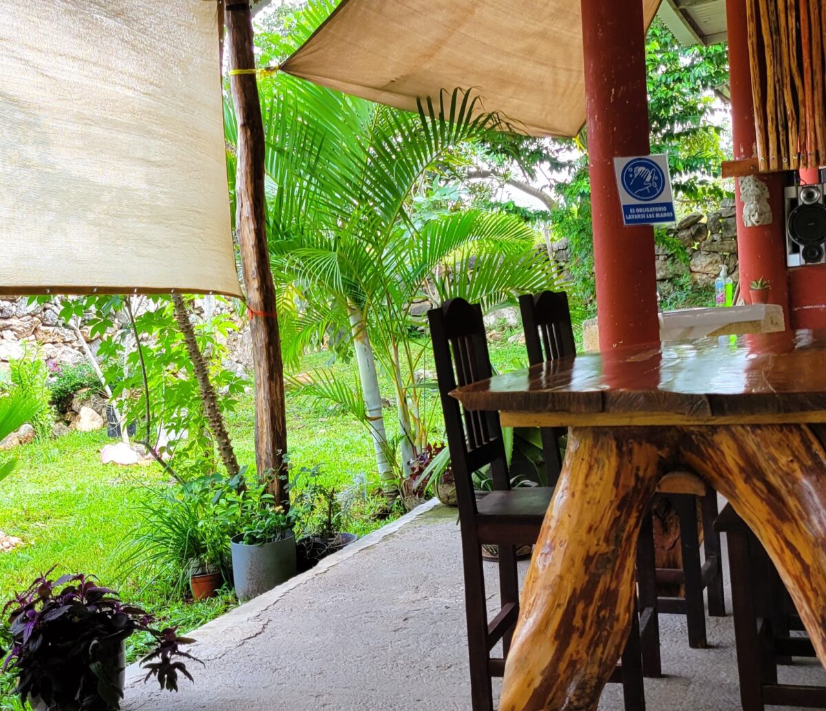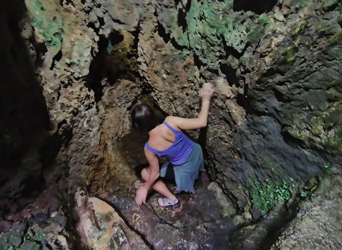 On our way back, we swung by Tzalam Kimbila for a repeat of our morning feast. While munching on our goodies, Paul spotted something intriguing: stone steps disappearing into the ground. Naturally, we had to investigate. Gabriel, the waiter, grabbed a flashlight and we followed him down the slippery stairs. The cool, humid air hit us like a wave, a welcome relief from the warm afternoon sun above.