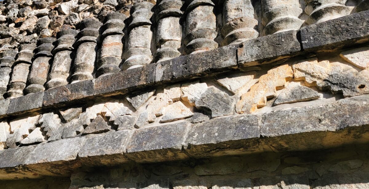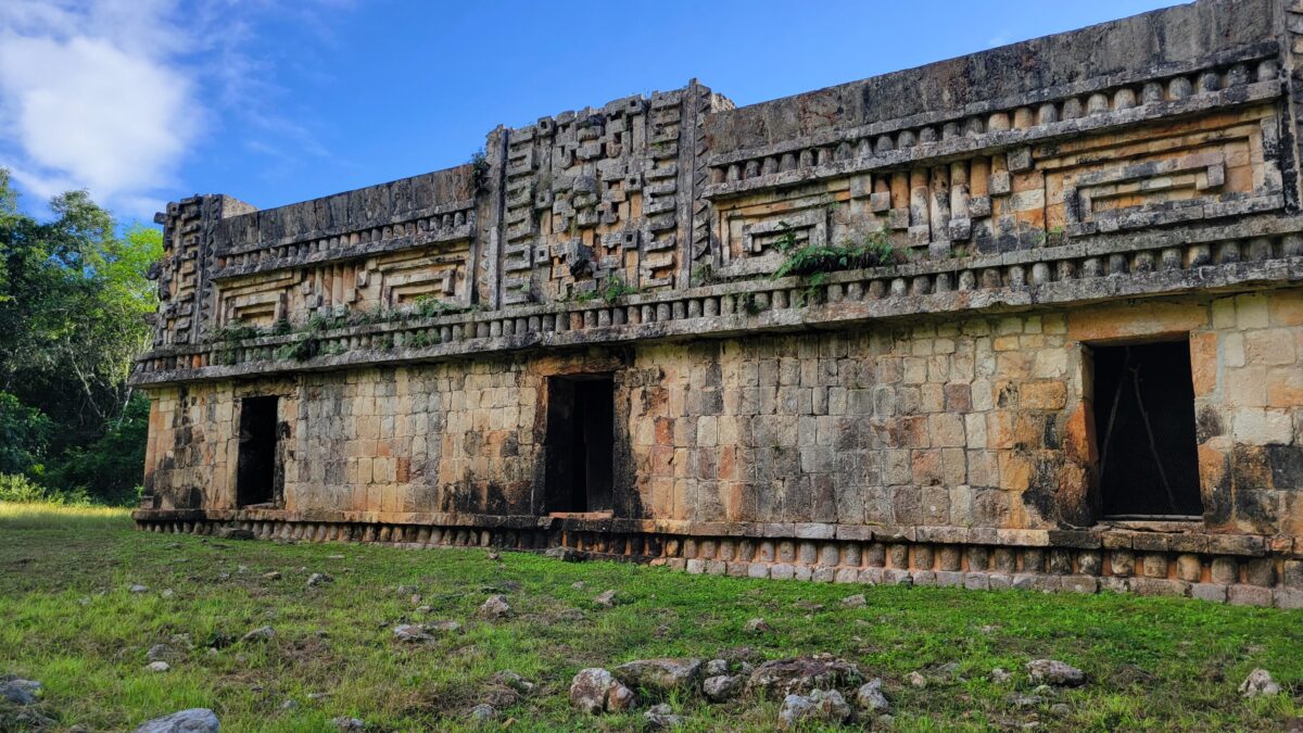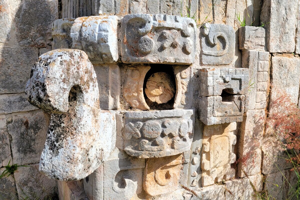 It’s the Palace of the Masks that really gets you in Kabah. Nearly 250 carved stone masks of Chaac, the Rain God, staring at you from the façade. Water was scarce, no cenotes in sight, so appeasing Chaac must have been the activity du jour.